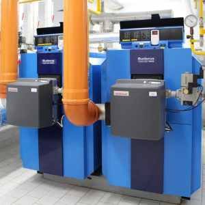 Byly instalovány dva stacionární plynové kotle, každý o výkonu 245 kW. Novým úsporným zdrojem tepla je kaskáda dvou stacionárních nerezových kondenzačních kotlů Logano plus SB625-240 s nízkoemisními přetlakovými hořáky Weishaupt. Zajímavostí je, že hořáky jsou uzpůsobeny pro nasávání spalovacího vzduchu z venkovního prostředí (spotřebič typu C). Kompletní otopný systém kaskády kotlů a otopných okruhů je řízen regulací Buderus Logamatic řady 4000.